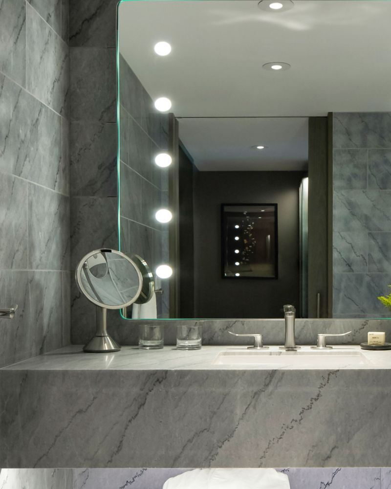 我们宽敞的转角套房可俯瞰洛杉矶天际线美景,配备 3 个带家具的私人阳台、带沙发床的独立起居室、餐桌椅以及客用浴室。主卧室设有带双盥洗台的宽敞浴室。