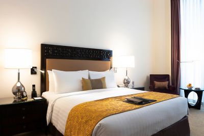 费尔蒙客房内,自然光由落地窗倾泻而入,堪称耸立于城市之上的精致休憩之所。客房内配备一张豪华特大床,拥有现代风格设计和宽敞的休闲空间,商务休闲皆宜。
