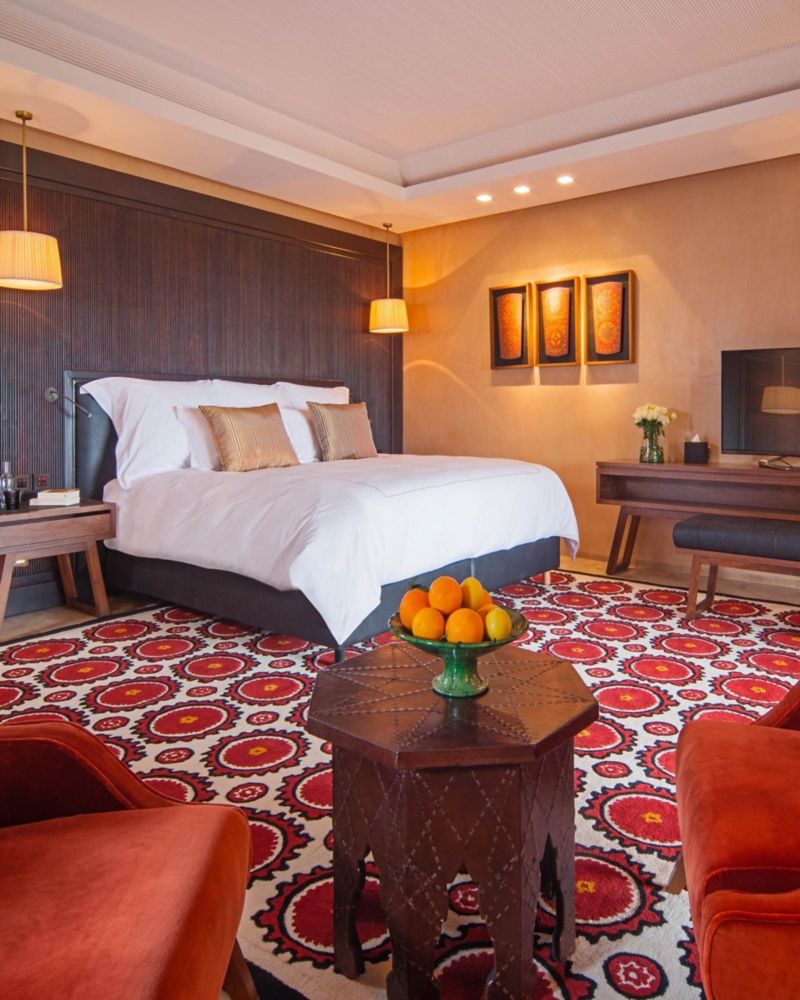 This 72 sqm room offers a refreshing terrace opening onto the golf course and Atlas mountain range, a magnificent bedroom with an integrated lounge and a luxurious marble bathroom with beijmat floors.