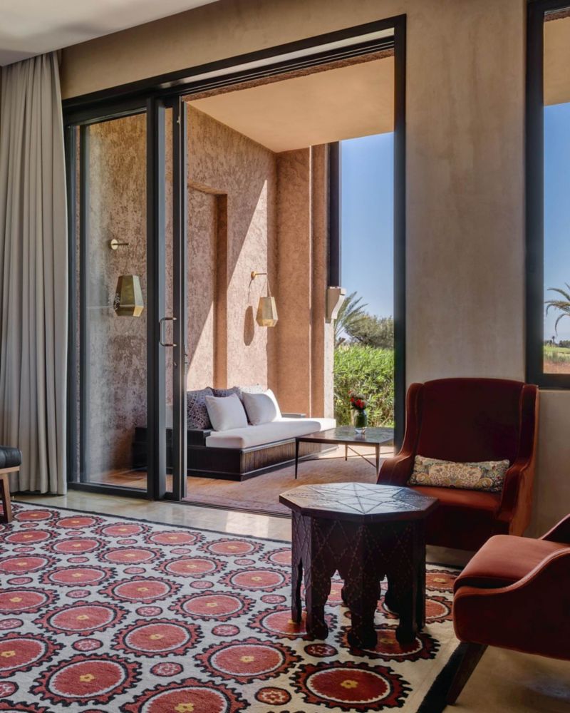 Separate bedroom and living room. Comfort and elegance are essential words to describe this his luxurious suite of 126 ssm. The lounge area connects onto the outdoors through a large terrace with sweeping views of the golf course and Atlas Mountains.