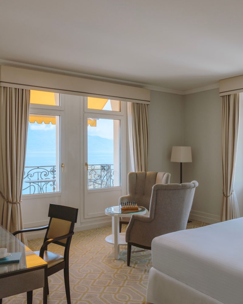 The Junior Lake View Suite is a luxurious open-concept room with an elegant design, where you can admire the amazing view on Lake Geneva and the Alps from the large balcony, offering a King or Twin bed, a sofa bed, and luxury amenities.