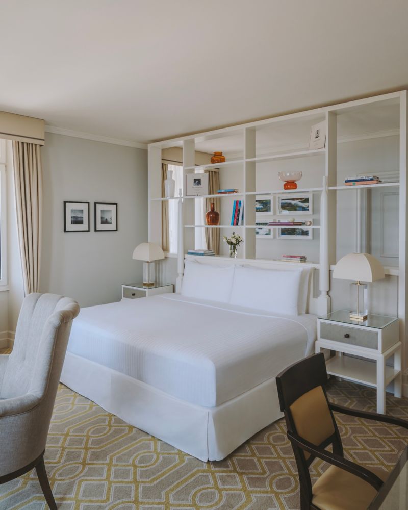 The Bellevue suites feature spacious bedroom with oversized bed, modern furniture, in-suite iPad directory and adjacent bathroom entirely marbled.