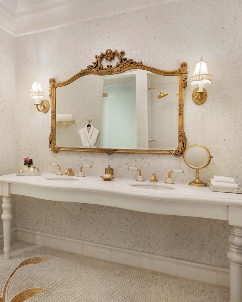 The Junior Suite King features up to 700 sq. ft. of living space with a partition between the king bed and sitting room for privacy. The bathroom is finished with inlaid "earth stone" mosaics and include a luxurious bathtub and separate shower. Among many splendid details are 24-carat gold-plated Sherle Wagner fixtures, as well as hand-crafted solid white marble vanities and wet bar.