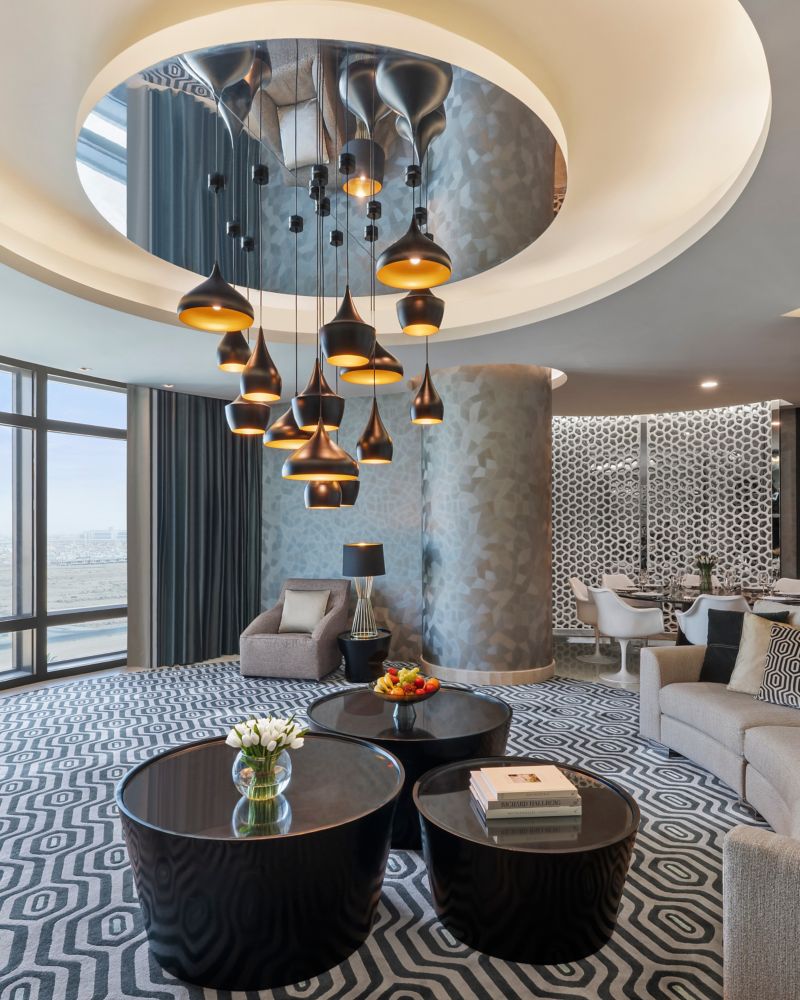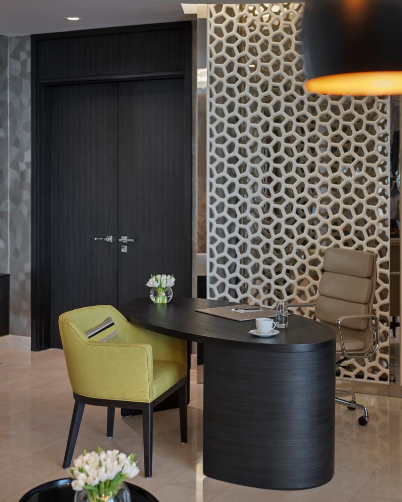 家具装饰现代优雅,充满艺术气息,尽显都市摩登风范。套房包括 2 间卧室、起居室/餐厅、厨房和办公室、金尊休闲区使用权、管家服务,套房面积 268 平方米(2885 平方英尺)。