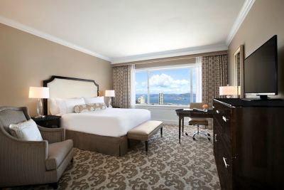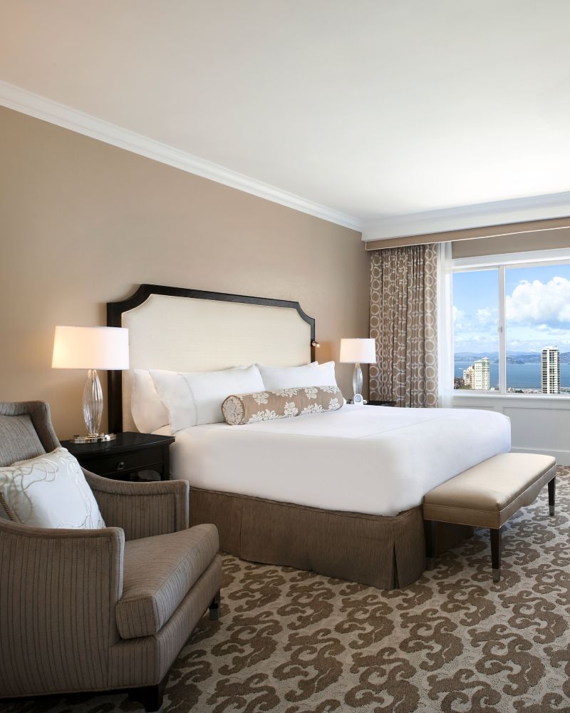 Located in the tower building with inspiring San Francisco Bay views, these king rooms include marble bathrooms with a separate shower and bath tub, work desk and sitting area. The spacious guestrooms feature picture windows with unparalleled views of the Bay, Alcatraz and Coit Tower. Higher floors can also see the Golden Gate Bridge.