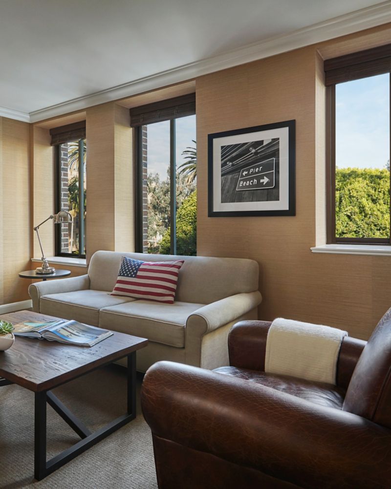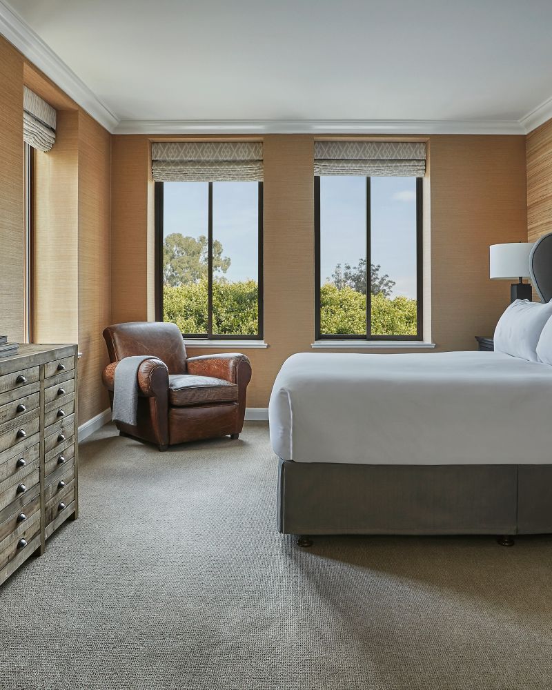 Comfortable and expansive, the 1924-built historic Palisades Wing hosts spacious Palisades King Suites with separate living rooms that create better getaways. Each suite, featuring laid-back classic California decor, includes a cozy sofa, cushy wingback chairs, sturdy wood furnishings, and a marble bathroom.