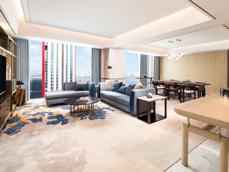 尊享套房包括 2 间卧室、2 间浴室和 1 间带沙发和三人餐桌的起居室。您可以使用金尊休闲区,那里将提供每日早餐和下午茶。※ 客房图片可能与实际安排的景观不同。