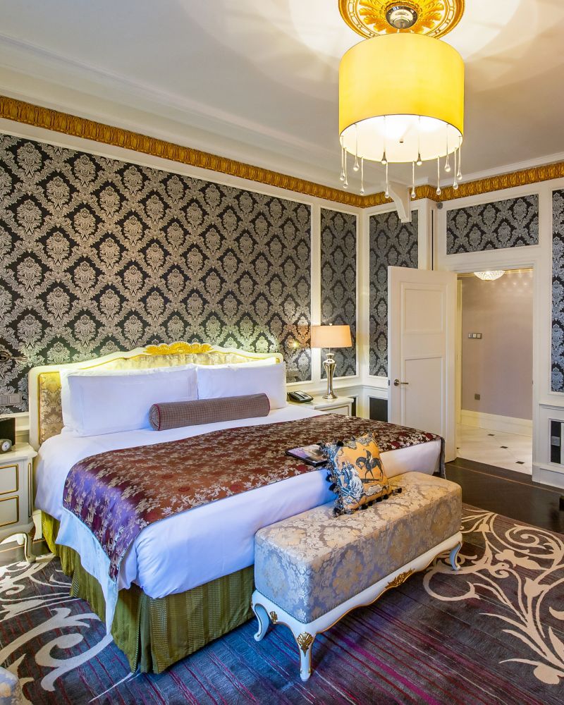 520印度套房因其富裕,浓烈的色彩而闻名。金银丝镶嵌的墙壁、奢侈的吊坠挂灯及色彩丰富的印度地毯极具特色。套房设有一个客厅和一个单独的餐厅可容纳最多 8 人享受私密晚餐。