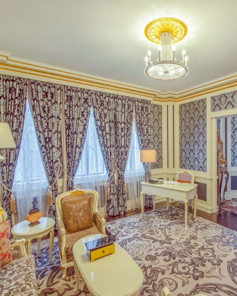 720 英国套房面积178平米,包含客厅、餐厅、卧室和浴室。套房内年代久远的木质地板、玫瑰花纹的顶部雕刻无不彰显了英国维多利亚时期的辉煌。