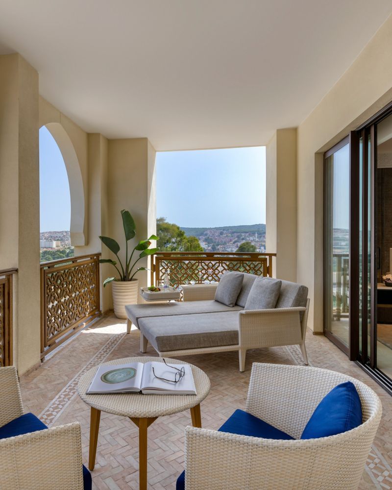 Our Junior Suites with Panoramic View feature a majestic bedroom, lavish marble bathroom, and chic lounge area. Enjoy a private balcony with stunning Tangier skyline views, perfect for a luxurious retreat.