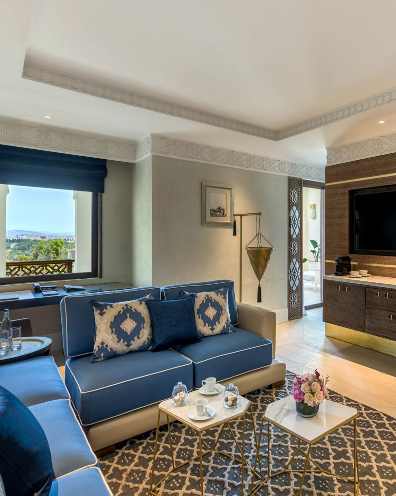 Our Junior Suites with Panoramic View offer a luxurious retreat for couples and honeymooners. Enjoy a majestic bedroom, lavish marble bathroom, and chic lounge area. Expansive balconies provide breathtaking views of Tangier’s skyline and white rooftops, blending traditional Moroccan decor with vibrant Mediterranean elements for an unforgettable stay.