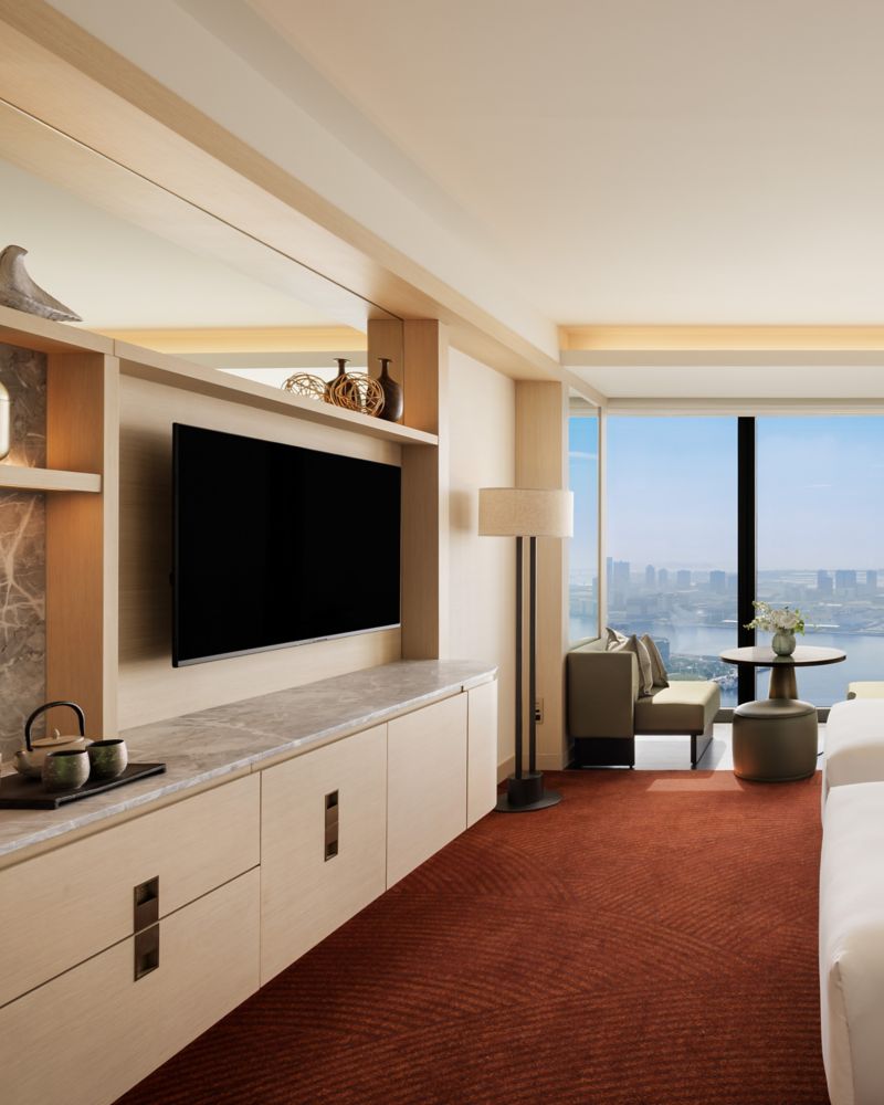 Wake up to the majestic view of Tokyo Bay. The room features an elegantly appointed bathroom with Le Labo, Marshall speaker and a Nespresso Machine to set the perfect ambiance for your stay. Up to 2 adults and 1 child (11 and under).