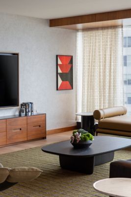 Designed by celebrated artist Douglas Coupland, this expansive suite offers luxury living, complete with private patio and breathtaking views. Features include artist designed vibrant art installations, custom furnishings, 75in TV and soaker tub.
