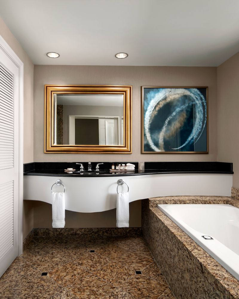 普通套房拥有开放式休闲空间,设有起居区和大沙发床,适合小型家庭入住。隔音落地窗、带双盥洗台的超大浴室、水疗浴缸和独立淋浴。