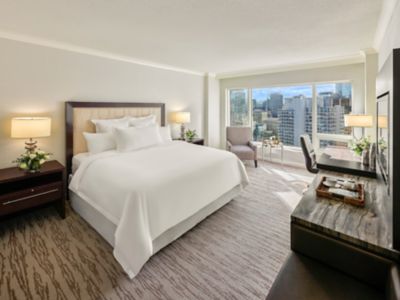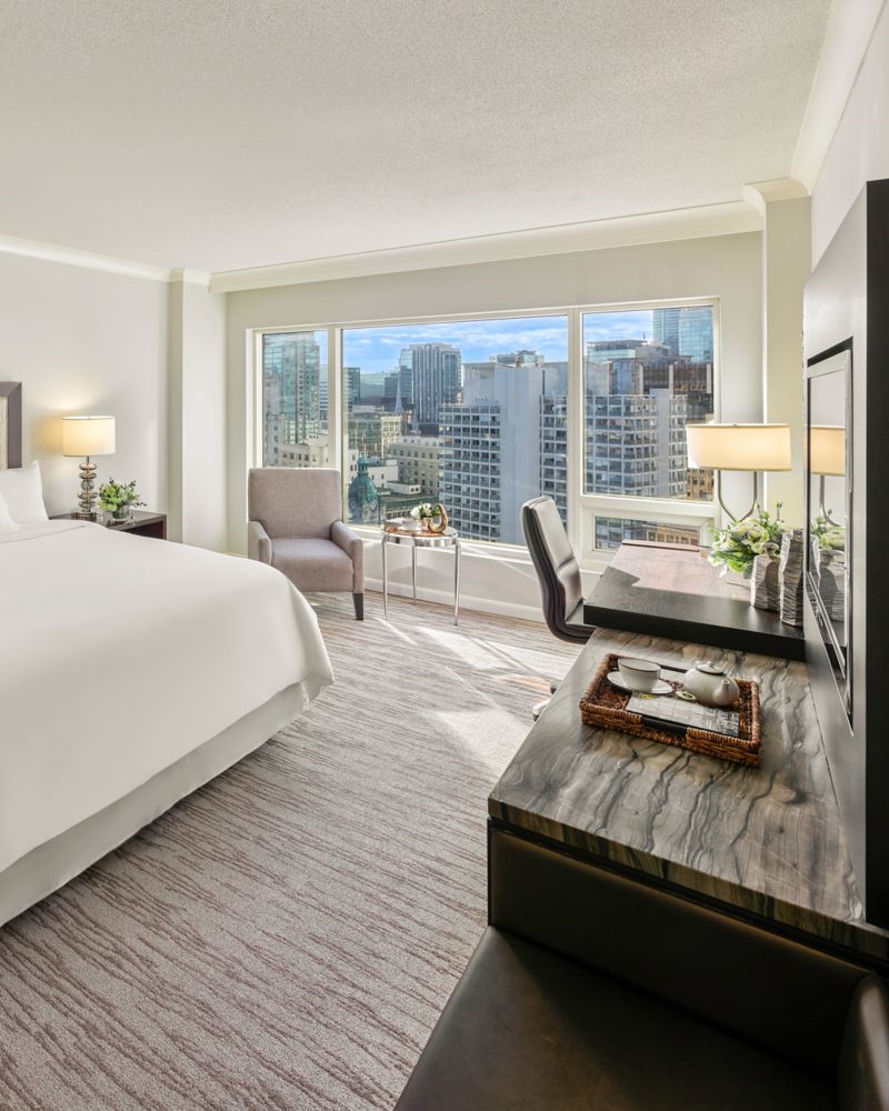 豪华高层客房,可欣赏到海港、斯坦利公园和北岸山脉的壮丽美景,面积 33-40 平方米(360-430 平方英尺)。