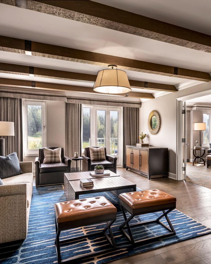 这些时尚套房可欣赏惠斯勒山谷和彩虹山的壮丽美景,面积 44 平方米(475 平方英尺),配备 1 张特大床 + 双人沙发床,私人卧室与起居区通过法式门隔断,提供 2 台电视、浴室四件套和高速上网。
